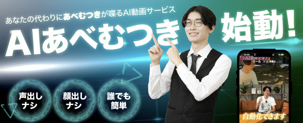 テキストを入力するだけで、あべむつきの声と表情で動画を生成できる次世代の発信ツールです。